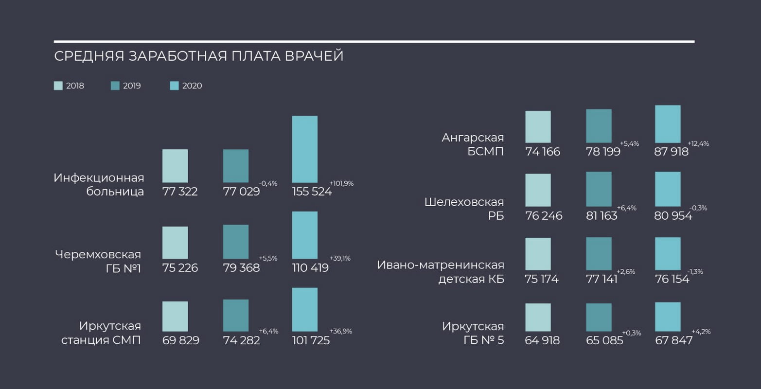 Есть перекосы по зарплатам. В иркутских городских больницах № 5 и № 6 средняя зарплата врача в 2020 году была 67 тысяч рублей. В этих больницах явное неисполнение указа президента, согласно которому зарплата врача в 2020 году должна была составить 85 тысяч рублей. Кто пойдёт работать туда?