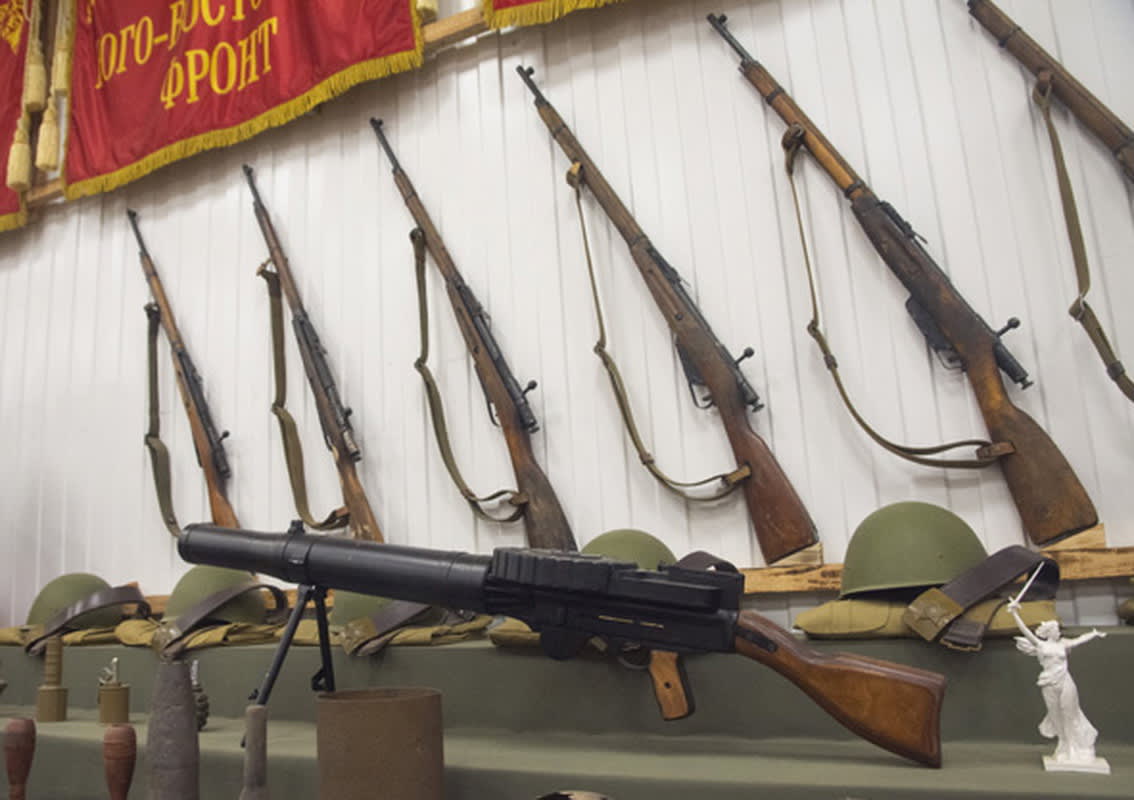 Награды одного из них, уроженца Куйтунского района Иркутской области Николая Пинчука, выставлены в витрине в здании, которое построили при полигоне. Здесь же находится коллекция оружия. Точнее, массово-габаритных макетов винтовок Мосина, пистолетов-пулемётов Шпагина и Судаева, советских пулемётов Максима и Горюнова, английского «Льюиса» и немецких MG-34 и MG-42. Есть и подлинные артефакты с мест боёв. Ещё в одном зале выставлено более современное оружие. Часть импровизированной экспозиции посвящена истории российского флота, ещё одна рассказывает о временах Вещего Олега.