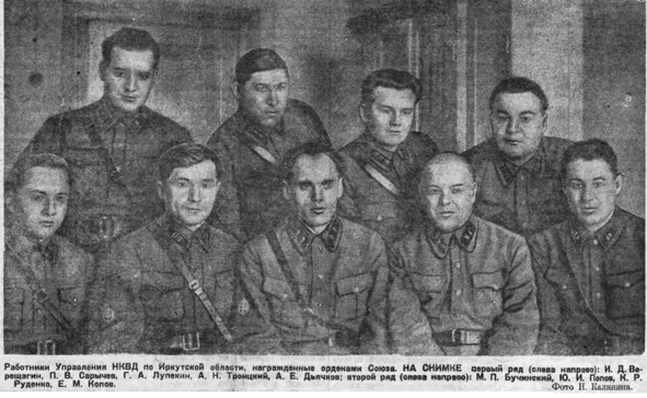 – За образцовое и самоотверженное выполнение важнейших правительственных заданий ЦИК СССР наградил работников Управления НКВД по Иркутской области. Ордена Ленина удостоен начальник Управления Г. Лупекин, ордена Красной Звезды – старший лейтенант П. Сарычев, старший лейтенант А. Дьячков, старший лейтенант А. Троицкий, лейтенант П. Бучинский, младший лейтенант Е. Копов, лейтенант Ю. Попов, лейтенант И. Верещагин, ордена «Знак Почёта» – младший лейтенант К. Руденко.