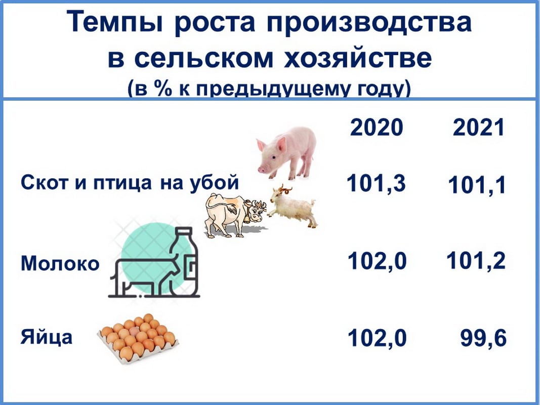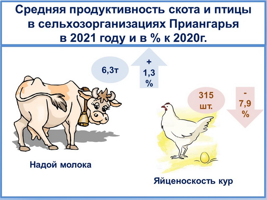 Рекордная прежде яйценоскость кур в сельхозорганизациях Приангарья снизилась и составила 315 штук на одну несушку за год. Но продуктивность коров в сельхозорганизациях продолжает расти, на одну корову надоено в среднем по 6,3 тонны молока. Много лет назад средний надой был вдвое меньше. Но с тех пор сокращение молочного стада происходило за счёт ликвидации в первую очередь малопродуктивных животных, а фермы, перенёсшие все реформенные перипетии, взяли курс на разведение племенного скота.