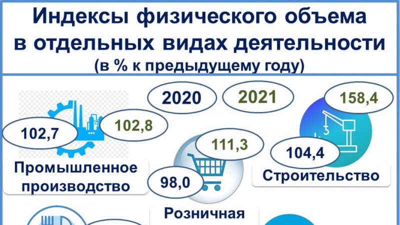 В обрабатывающих производствах в целом сохранился прежний объём, возросший в 2020 году на 11%. Однако резко снизился выпуск металлических изделий, электрического оборудования, сократилось производство химической продукции, прочих транспортных средств и оборудования. Рост по другим направлениям был, как правило, незначительным, что не исключает заметного (на 15–40%) наращивания объёмов отдельных видов продукции.