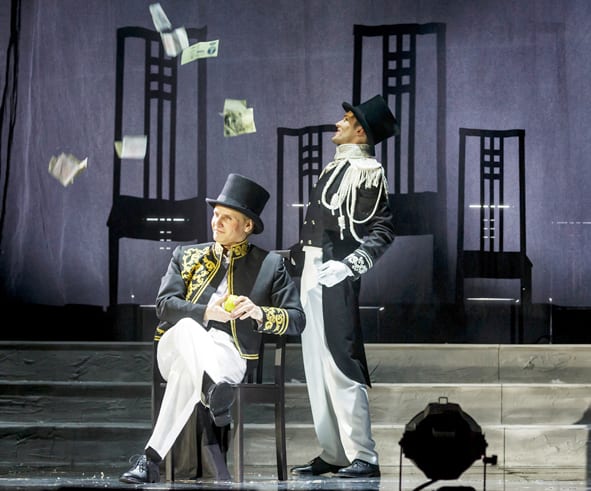 Этот эффект театра в театре, спектакля в спектакле явно транслирует и сценография. На сцене воссоздана другая сцена, где белые стены, выставленные углом и уходящие ввысь, отсылают к былым монументальности и величию. Испещрённые временем, с отбитым рельефным орнаментом, они будто свидетельствуют о падении культуры и измельчании человека. Театральности добавляет и суконный занавес, исполненный в цвете карточных игорных столов и создающий дополнительные метафоричные образы. Раскручиваясь, он застилает всю сцену, намекая на игру по-крупному – за души человеческие, а иногда он становится тоннелем, пережёвывающим «отработанных», выполнивших свою функцию персонажей.