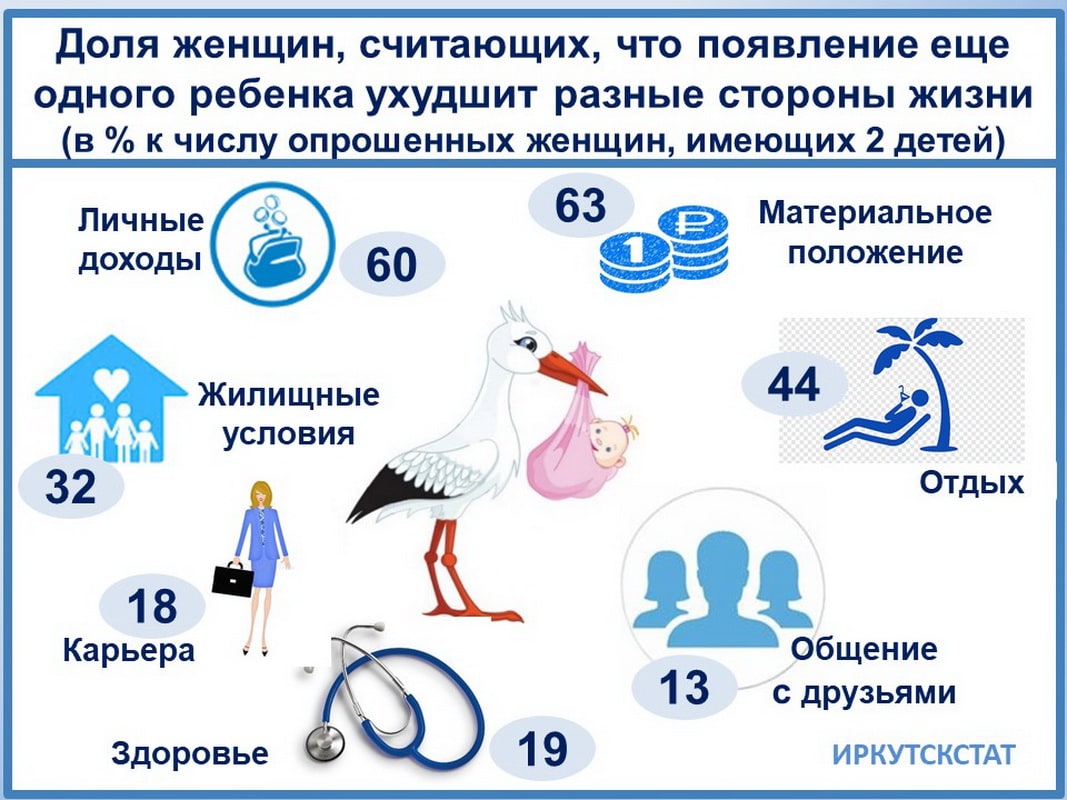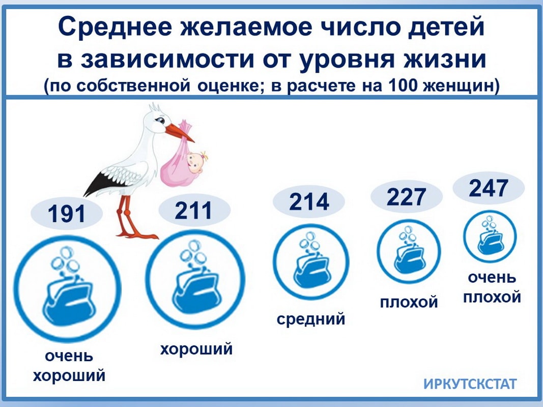 Отказываясь рожать, часто ссылаются на отсутствие условий. Но статистика доказывает, что материальное благополучие семьи не стимулирует многодетность. При очень хорошем (по собственной оценке) уровне жизни в расчёте на 100 женщин – 191 желанный ребёнок, а при очень плохом – 247, то есть многие малообеспеченные женщины хотели бы иметь троих детей. Такая странная закономерность: по мере ухудшения материального положения планы деторождения возрастают. Аналогичная ситуация и в отношении жилищных условий: чем хуже они, тем сильнее желание иметь детей, что можно объяснить надеждой на улучшение условий проживания за счёт материнского капитала. И мужское мнение по данном вопросу практически совпадает с женским.