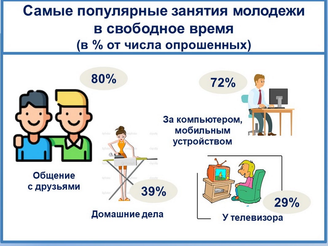 Судя по данным опроса, надёжными друзьями молодёжи стали компьютер или мобильное устройство, общаться с ними предпочитают 72% наших молодых земляков. Но есть множество других занятий, интересных каждому, поэтому сумма ответов намного больше 100%.