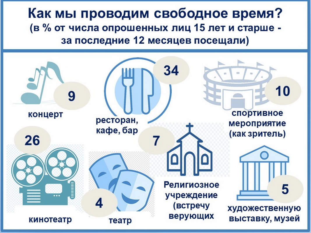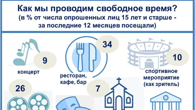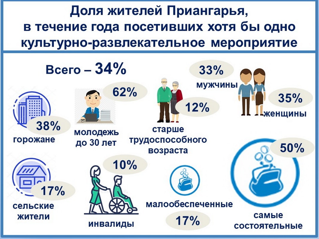 Наиболее популярно кулинарное направление, 34% опрошенных жителей Приангарья в возрасте от 15 лет и старше за год успели посетить ресторан (кафе, бар). Кинотеатр заметно уступает (26%). Лишь в группе наших молодых земляков (до 30 лет) кино побеждает: 55% побывали в кинотеатре, тогда как общепитовский сервис испытали 44%.