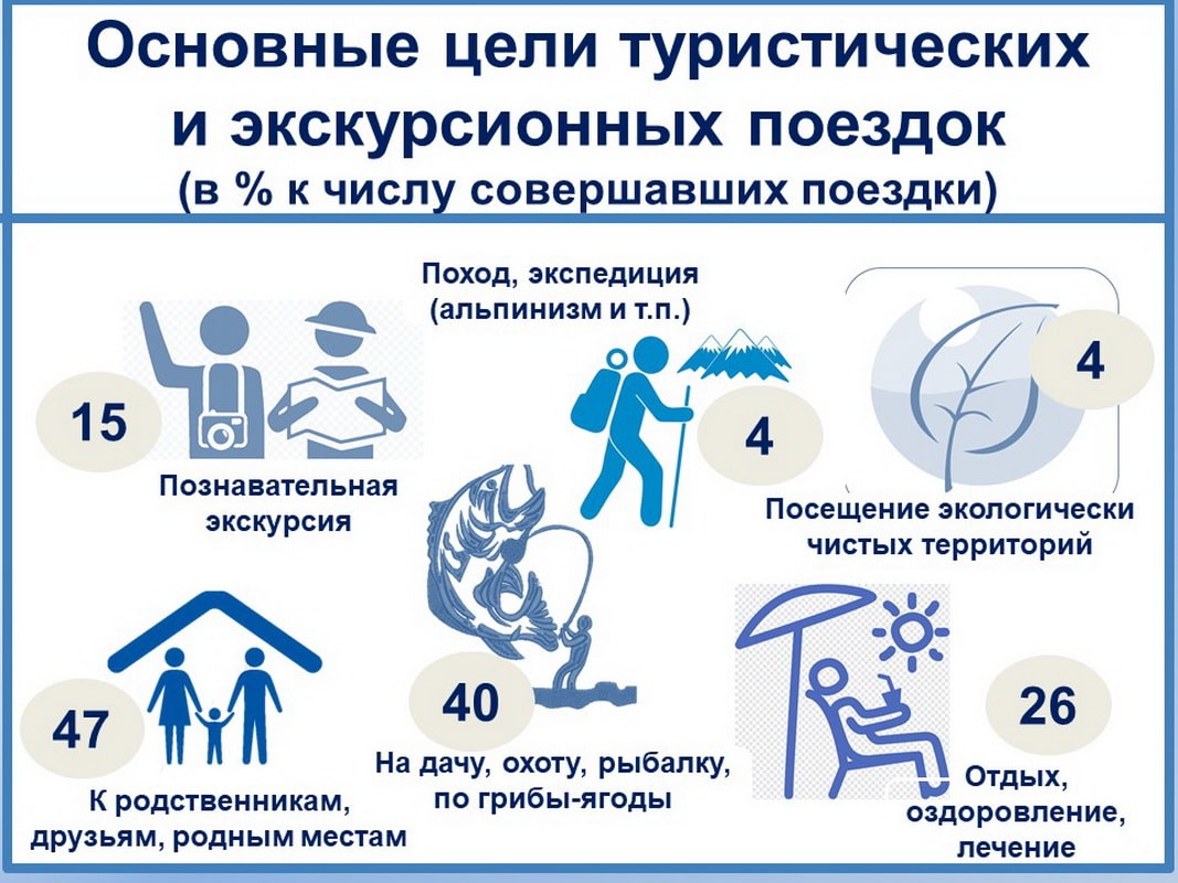 Наиболее распространённые поездки, пожалуй, не являются экскурсией или туризмом, но всё же это выезд из дома, смена обстановки, свежий воздух. Каждый второй из числа выезжавших направлялся к родным местам, друзьям и родственникам, а 40% – на дачу, охоту, рыбалку, по грибы да ягоды.