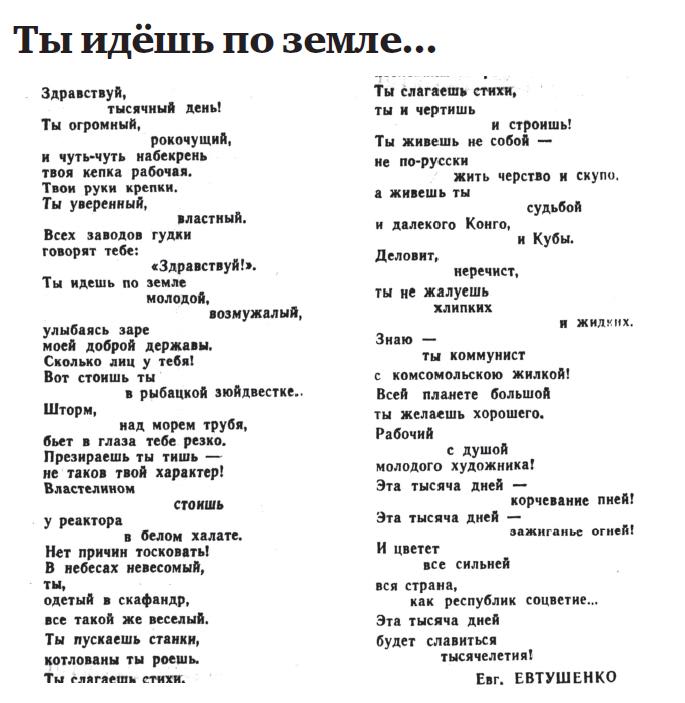 Обычно стихи в советское время публиковались на последней или предпоследней страницах газет, а если на первой, то только либо в какой-нибудь праздник, либо по случаю выдающегося события. Пробежал глазами весь номер и обнаружил, что он посвящён исполнившемуся 26 сентября тысячному дню выполнения плана социально-экономического развития страны на 1959–1965 годы – так называемой семилетки. Стихотворение обогатило сквозную рубрику «Тысячный день семилетки», более того, в передовой статье «1000 героических дней» газета отметила: «Замечательно сказал об этом (о достижениях семилетки. – Авт.) один из талантливых советских поэтов Евгений Евтушенко: