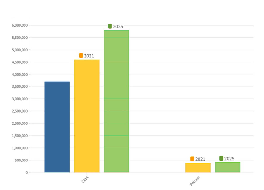 – Очевидно, что за 30 лет в стране формировалось и «местное» производство, расширялось число IТ-компаний, увеличивалась их выручка, росла численность сотрудников. В 2021 году в IТ-сфере в России было задействовано 384 тысячи человек, в 2025 году прогнозируется рост до 420 тысяч человек. Для сравнения: в США число специалистов в IТ-сфере в десять раз больше, и растёт она быстрее, чем у нас. Ожидается, что с 4,6 миллиона сотрудников в 2021 году она увеличится до 5,8 миллиона к 2025 году. Да и численность наших и зарубежных IТ-компаний просто несоизмерима.