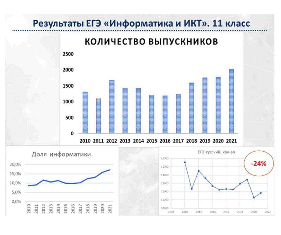 Растут конкурс и одновременно средний проходной балл в вузах. Огромный приток отмечается в средних специальных учебных заведениях. Школьников, желающих сдавать ЕГЭ по информатике, много, и число их увеличивается.