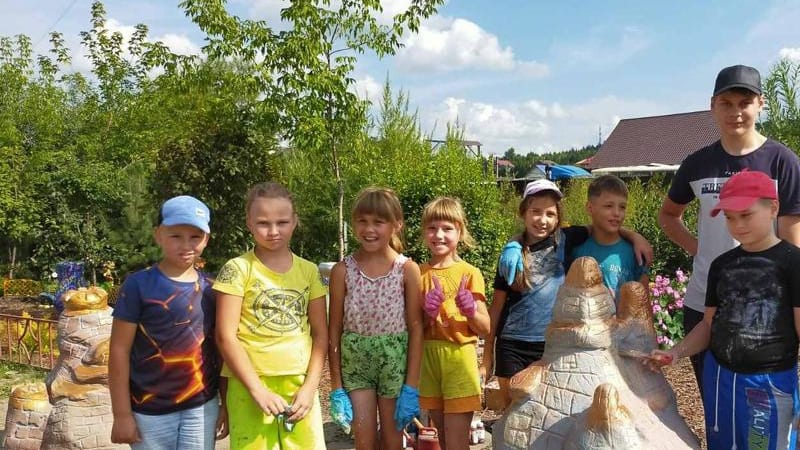 Также провели мастер-класс по изготовлению искусственных камней. В первый день приготовили основу, накрыв каркас отрезом ткани, пропитанным цементным раствором. На следующий день конструкция покрылась раствором цемента и песка, камни приобрели свои очертания. Из валунов, нескольких мешков песка и цемента под руководством заместителя руководителя ТОС «Лесной» Тамары Олексюк дети и подростки возвели замки, раскрасили их и установили заборы.