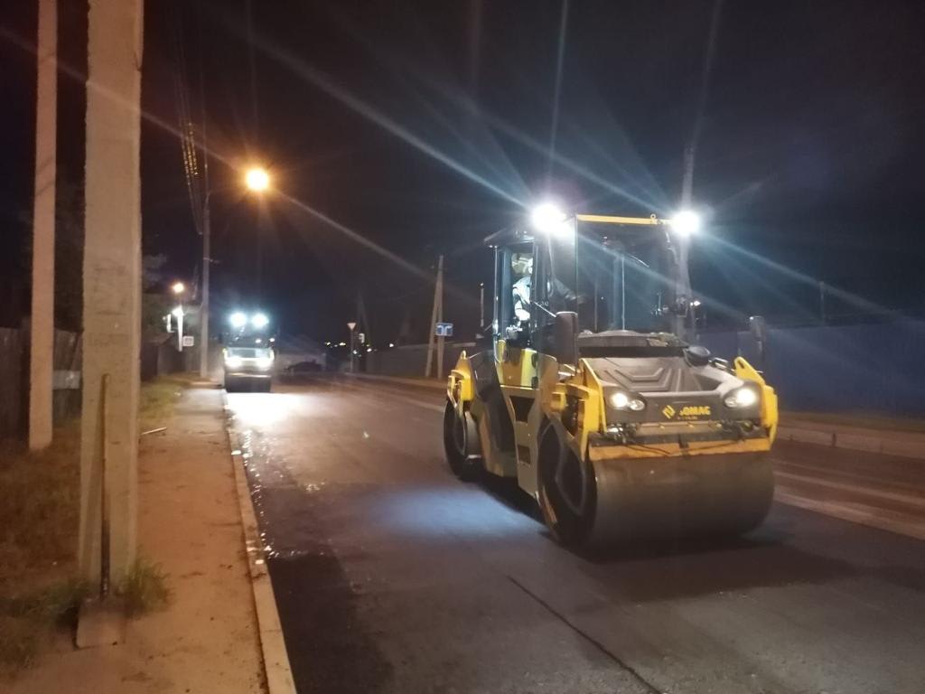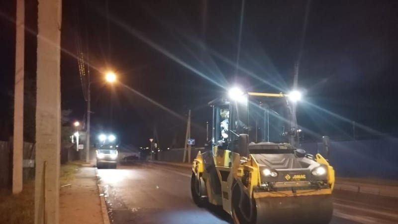 Работы проводят в ночное время, чтобы не создавать затруднений для движения транспорта. Выполнено фрезерование верхнего слоя старого асфальта на улице Розы Люксембург. Следующим этапом будет уложен новый слой дорожного покрытия.