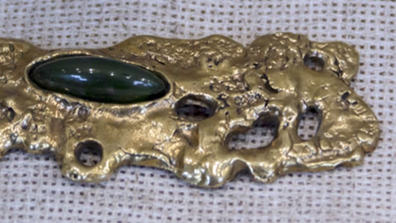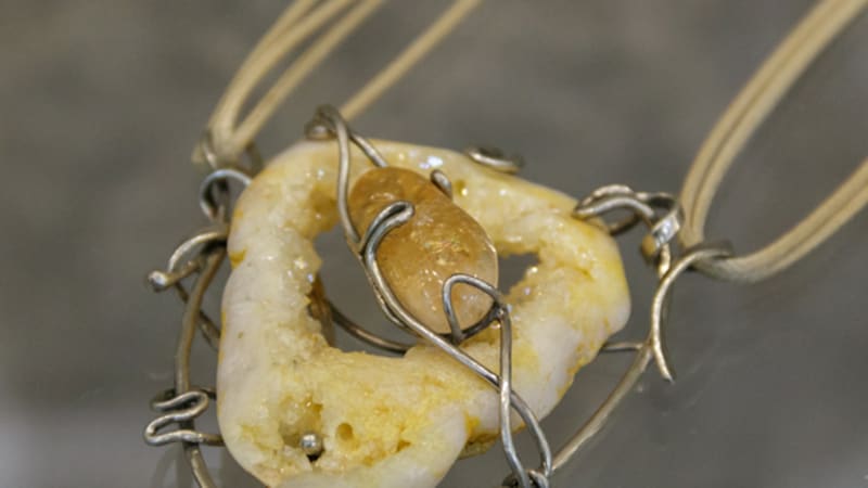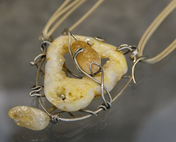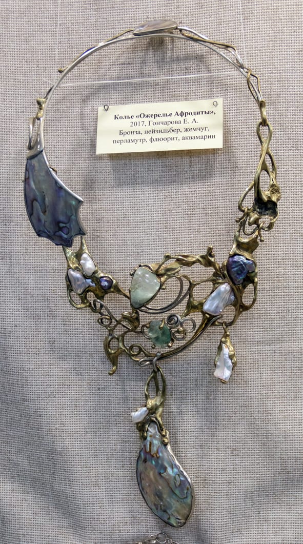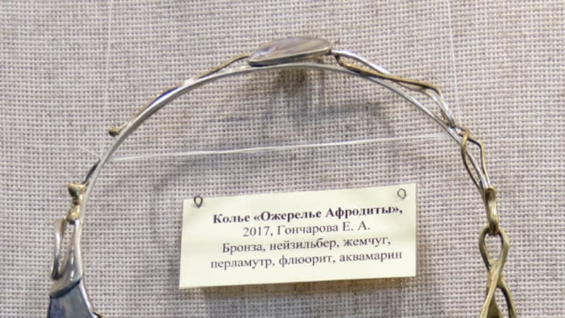 В витринах выставки обращает на себя внимание серия украшений с литьём – бронзовая основа дополнена бусинами, кожаными шнурами, элементами из резаной кости. Нефритовые колье подкупают простыми, чёткими линиями и изяществом.