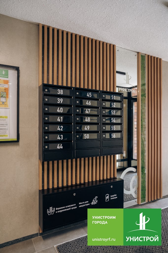 Входные группы находятся на уровне земли, домофоны расположены в утепленных тамбурах. На первых этажах есть колясочные. Для отделки холлов и общественных территорий использованы природные материалы нейтральных оттенков.