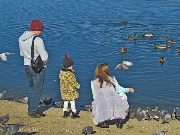 Говоря ребёнку, что на острове-парке птиц никто не обижает, женщина, конечно же, имела в виду, что их не обижают люди. А у меня давно уже сложилось впечатление, что здесь вообще никто никого не обижает. Любопытную сценку наблюдал пару лет назад. На мелководье прибило к берегу большой (едва ли не полбатона) кусок размокшего хлеба, вокруг которого собрались на обед несколько голубей. Одни отклёвывали крошки с берега, другие для удобства забредали в воду. К пиршеству немедленно присоединились вездесущие воробьи, а потом приплыл ещё и селезень. Разномастная пернатая компания неплохо подкрепилась без ссор и драк. Никто никого ни разу не клюнул.