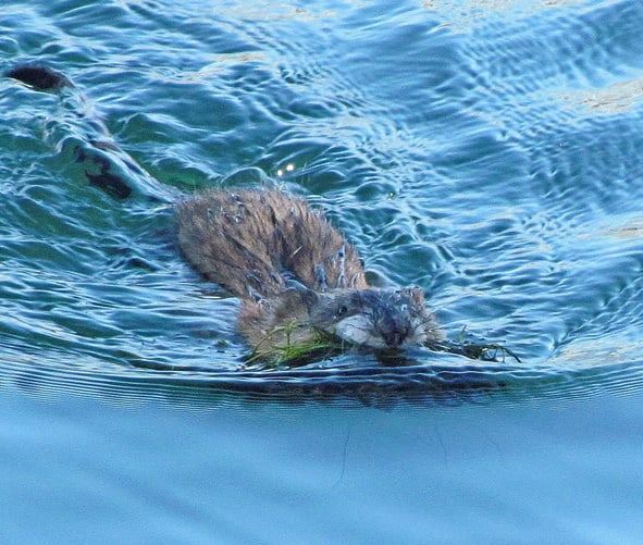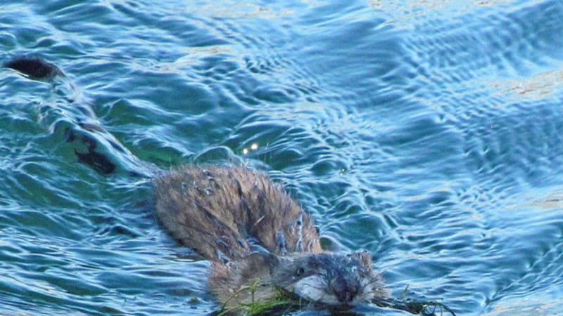 Ондатра, пересёкшая акваторию, как катер, неожиданно прекратила фотосессию, превратившись в «подводную лодку». За несколько метров до берега она вместе с пучком травы в зубах, не меняя скорость и направление движения, ушла под воду. Ей некогда обращать внимание на разных там уток и тем более позировать фотографу. Как и многие другие грызуны, мускусная крыса склонна делать зимние заготовки. Не настолько большие, чтобы всю зиму питаться, не выходя из дома, но чтобы на чёрные дни что-то всё-таки было. Для этого в её жилище даже предусмотрена кладовая.