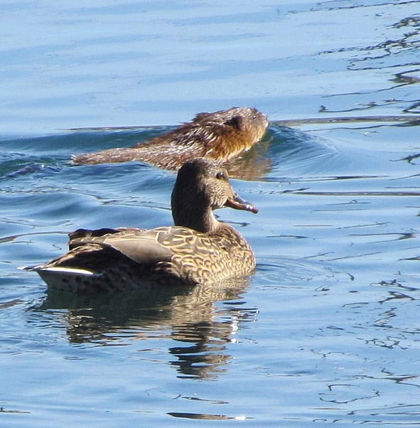 На желание зрительниц добавить в представление интриги я повёлся легко, потому что ондатра, плывущая к берегу с пучком какой-то водной растительности в зубах, удивила меня настолько, что я тут же забыл про ворону, хоть и чувствовал, что приличный её портрет сделать так и не успел. Удивила опять же не фактом своего присутствия в ангарских притоках – к этому посетители острова Юность давно уже привыкли, а тем, что через небольшую стайку диких уток она проплыла напрямую, вплотную к птицам. Едва ли не задевая тех, что оказались на её пути. Будто нет их здесь вовсе. Впрочем, и утки вместо того, чтобы испугаться и хотя бы немного посторониться, продемонстрировали​ мускусной крысе (это второе равноправное название ондатры) абсолютное равнодушие. Они в упор демонстративно не замечают крупного полуводного грызуна ни у себя под хвостом, ни под клювом. Водоплавающим птицам нечего делить с млекопитающим, поэтому они друг другу не интересны.