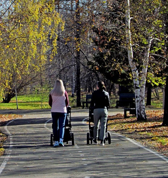 ​Здесь, в парке, даже люди друг к другу относятся иначе, чем на суетливых городских улицах. Теплее. Доверчивее. Улыбнуться незнакомому человеку, заговорить с ним, познакомиться – дело естественное. Природа к этому располагает. И ещё, наверное, настроение. В этот раз, фотографируя голубей на усыпанной ранетками яблоньке, я обратил внимание на проходящую мимо маму с коляской. Потом встретил ещё одну. А потом они попали мне в один кадр. Уже вместе, а не поодиночке. И те две женщины, переключившие моё внимание с вороны на ондатру, судя по обрывкам их разговора, познакомились только что.