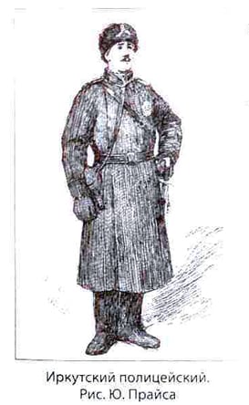 Рисунок «Иркутский полицейский» сделан Юлиусом Прайсом. Прайс – английский корреспондент и художник газеты «Иллюстрированные лондонские новости», побывавший в Иркутске в 1891 году. Рисунки, которые сделал в нашем городе Юлиус Прайс, были опубликованы в нескольких номерах газеты «Иллюстрированные лондонские новости» и послужили иллюстрациями к книге Прайса «От Северного Ледовитого океана к Жёлтому морю», изданной в 1892 году в Лондоне. «Полиция удивила меня своей хорошей организацией, – писал Прайс. – В дневное время конная полиция постоянно патрулирует улицы для предотвращения заторов транспорта на улицах – необходимая мера, особенно если учесть неосторожную езду, предпочитаемую сибиряками. В ночное время здесь всё ещё жива истинно восточная традиция, когда патруль ходит по улицам, непрерывно потряхивая чем-то вроде сигнального молотка, который издаёт звук, не похожий на звук трещотки, используемой нашими полицейскими. Причина такого пристрастия к этому примитивному обычаю мне осталась неясной. Возможно, сибирские воры очень нервные, и такое приспособление пугает их и заставляет воздерживаться от осуществления злостных намерений». |