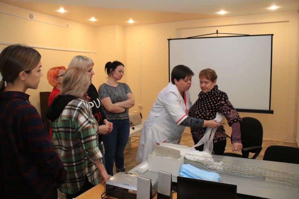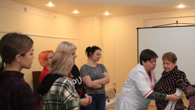 Первое занятие для волонтёров посвятили десмургии — науке о наложении повязок, — способам иммобилизации переломов и другим основам первой помощи. Дальнейшая программа включает отработку навыков проведения сердечно-лёгочной реанимации на тренажёре, изучение основ ухода за ранеными и пострадавшими и многое другое.