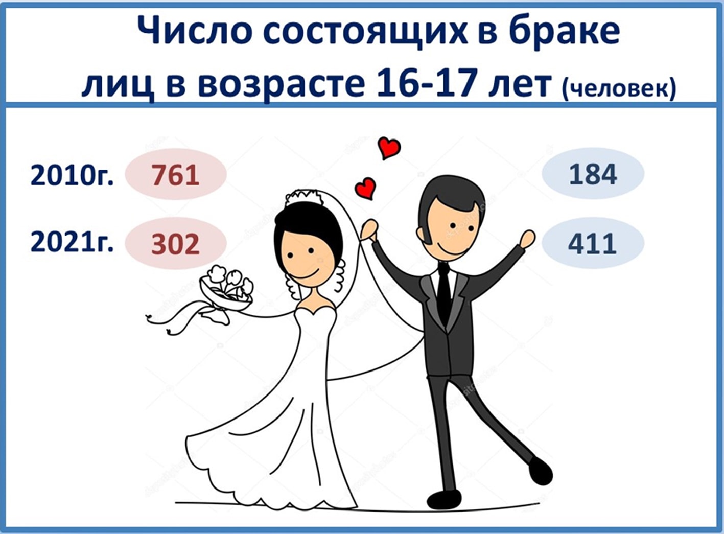 Интересно, что за 11 лет юных женихов стало в 2,2 раза больше, а 16-17-летних невест, наоборот, меньше в 2,5 раза.