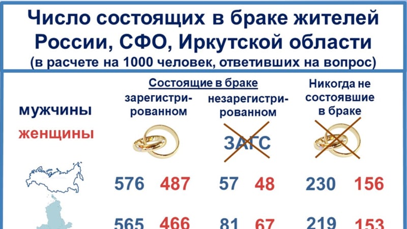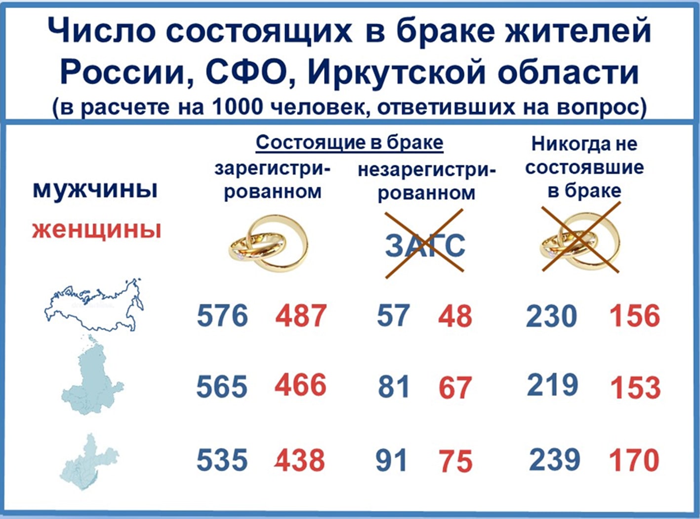 По сравнению с другими россиянами, в том числе с сибиряками, наши земляки мужского пола не спешат создавать семейный очаг (среди них выше доля никогда не состоявших в браке), а вступив в семейные отношения, не торопятся их регистрировать. Таким поведением они невольно создают подобную ситуацию и среди женщин Приангарья.