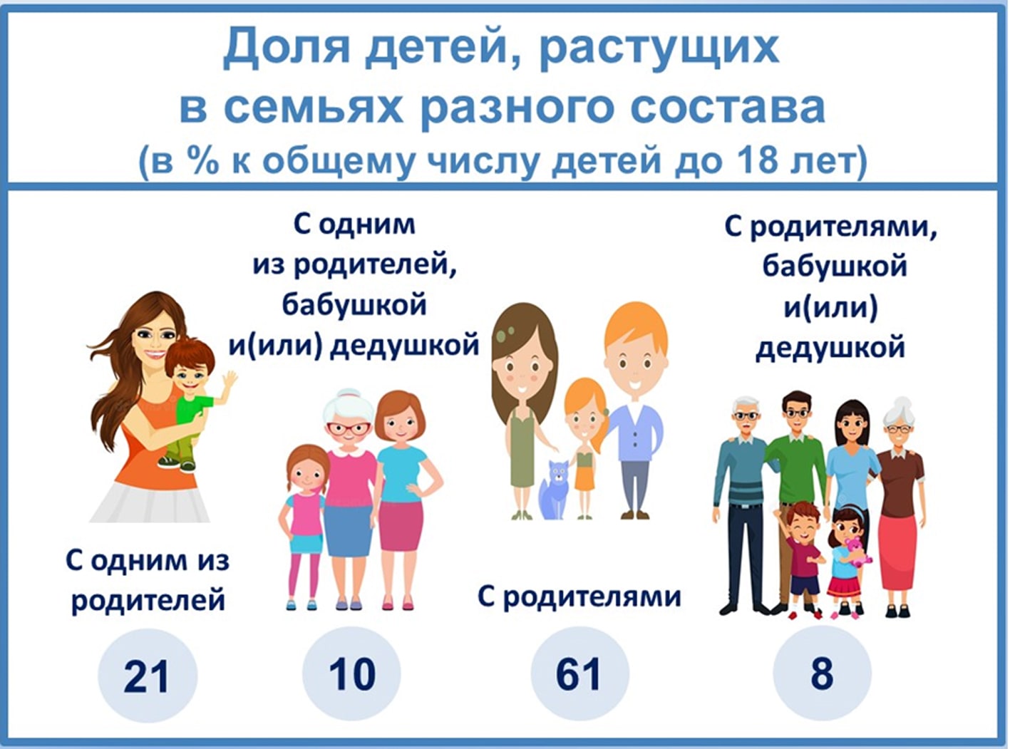 Есть семьи без второй «половинки», но при наличии других родственников, есть с уже повзрослевшими детьми.