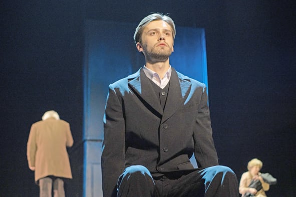 Не только эти знаковые чемоданы, обтёрханные, видавшие виды, набитые неподъёмной гравийной шелухой, таскают за собой Базаров, а вслед за ним и Аркадий Кирсанов (артист Артём Фальковский). Всё пространство вокруг «прогрессиста» расчеловечивается, становится почти не пригодным для житья. Цвета сцены – графитовый, бурый и чёрный. По вертикали движутся огромные кубы то ли зданий без окон, то ли камер. Эти тяжёлые конструкции теснят участников действия, словно норовят не оставить им места, выпихнуть за кулисы. Когда невидимые постромки убирают эти хексадедроны от нашего глаза, появляется длинная плаха стола – моста, качели, которая постоянно зыблется, не находит равновесия, «отрицает» идею надёжной опоры. Вращаются и широкие лопасти креста, по которым сидят и ходят в мёртвой пустоте неприкаянные персонажи. Эпицентром, источником этого некротического пространства является новый человек – самый блестящий студент университета, будущий доктор Евгений Васильевич Базаров.