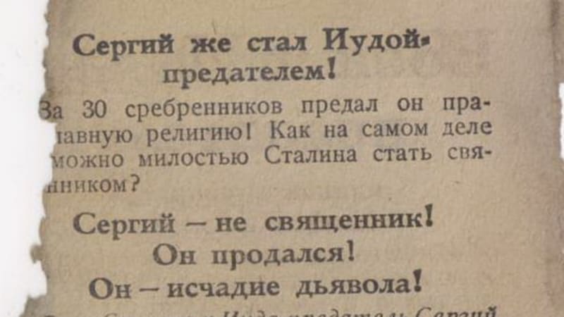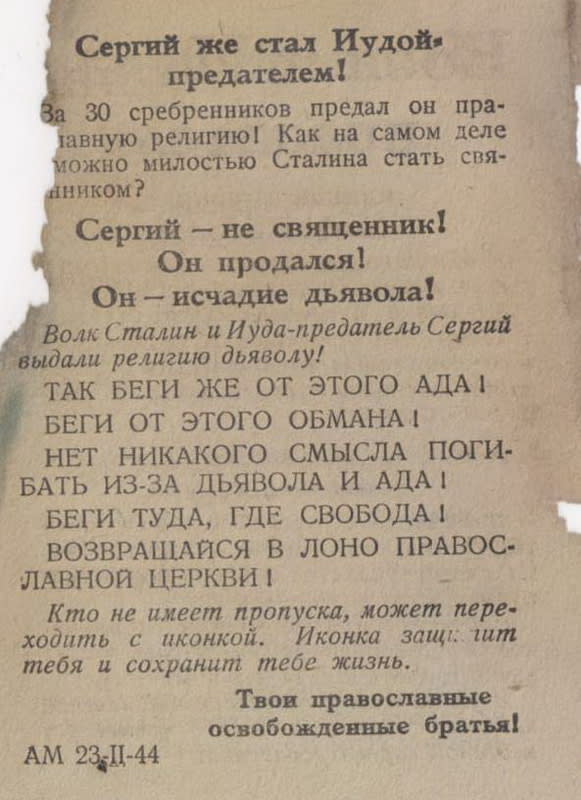 Рядом лежит листовка – призыв к советским верующим: «Волк Сталин и Иуда-предатель Сергий (патриарх Московский и Всея Руси с 1943 года. – Авт.) выдали религию дьяволу! Так беги же от этого ада!… Нет никакого смысла погибать из-за дьявола и ада!… Кто не имеет пропуска, может переходить с иконкой. Иконка защитит тебя и сохранит тебе жизнь». Есть и листовка, сделанная как красная «корочка», партбилет члена ВКП (б) на украинском языке. На обороте этого «партбилета» – призывы к коммунистам и комсомольцам без страха сдаваться в плен. Немцы обещали не проводить в отношении партийных никаких особых репрессий, что, конечно, было ложью.
