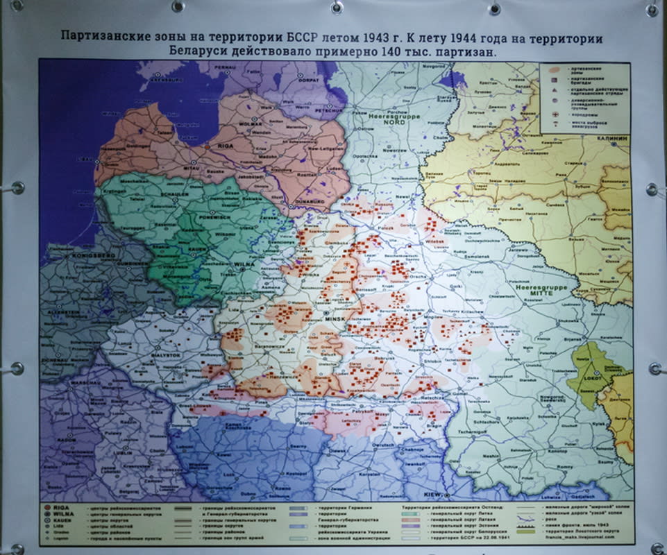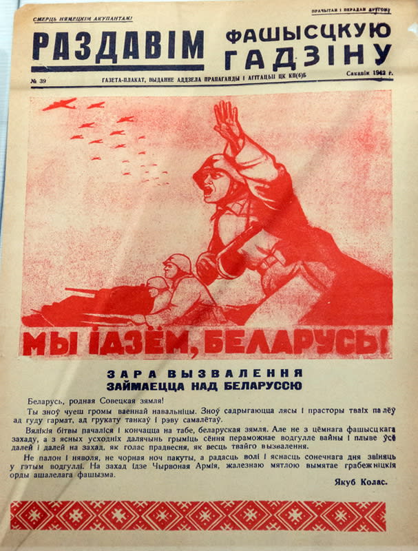 – Идея выставки появилась после обращения наших коллег из Музея Иркутской нефтяной компании, – рассказал заведующий экспозиционно-выставочным отделом Музея истории Иркутска Георгий Шутов. – Коллекционер Александр Церковский предложил продемонстрировать в наших стенах свою коллекцию агитационных материалов, листовок, открыток, газет военного времени. Мы развили данное предложение, и получилась эта выставка. 80 лет назад, в сентябре 1943 года, началось освобождение земли Беларуси от оккупантов. В ночь на 23 сентября 1943 года бойцы и командиры 360-го стрелкового полка 74-й стрелковой дивизии освободили посёлок Камарин, первое белорусское поселение. 16 военнослужащих 74 стрелкового полка за первые сутки боёв были представлены к званию «Герой Советского Союза». В братской могиле в Камарине похоронены 626 человек, четверо – Герои СССР. Такова была цена освобождения одного городского посёлка. Последовали другие сёла и города. Следующий масштабный шаг был совершён летом 1944 года, когда войска четырёх фронтов нанесли сокрушительный удар: была проведена белорусская стратегическая наступательная операция «Багратион». И Беларусь стала свободной. С 1941-го по 1944 год ей пришлось пережить тяжелейшие испытания, связанные с оккупацией. Были созданы концлагеря, к заключённым применялись пытки, людей вывозили в фактическое рабство за пределы страны. История не знает примеров, когда уничтожение мирного населения осуществлялось с таким масштабом и ожесточением, как в Беларуси. Но против фашистов в первые же дни войны было организовано мощнейшее партизанское движение. К декабрю 1941 года в партизанских отрядах Беларуси было 12 тысяч человек, а в 1944-м, когда республика была освобождена, – 374 тысячи человек. За годы войны партизаны вывели из строя более полумиллиона фашистов, 125 тысяч были убиты, разгромлены более 11 тысяч эшелонов и 34 бронепоезда.