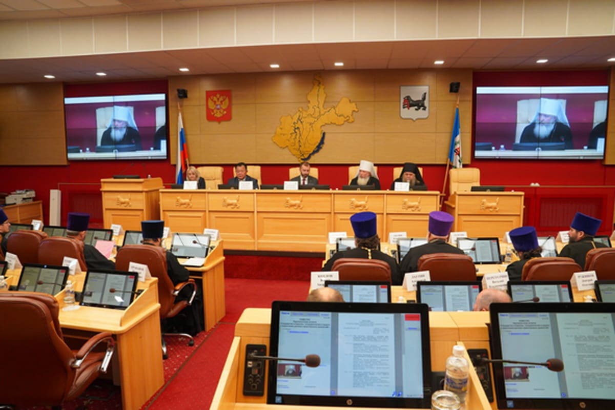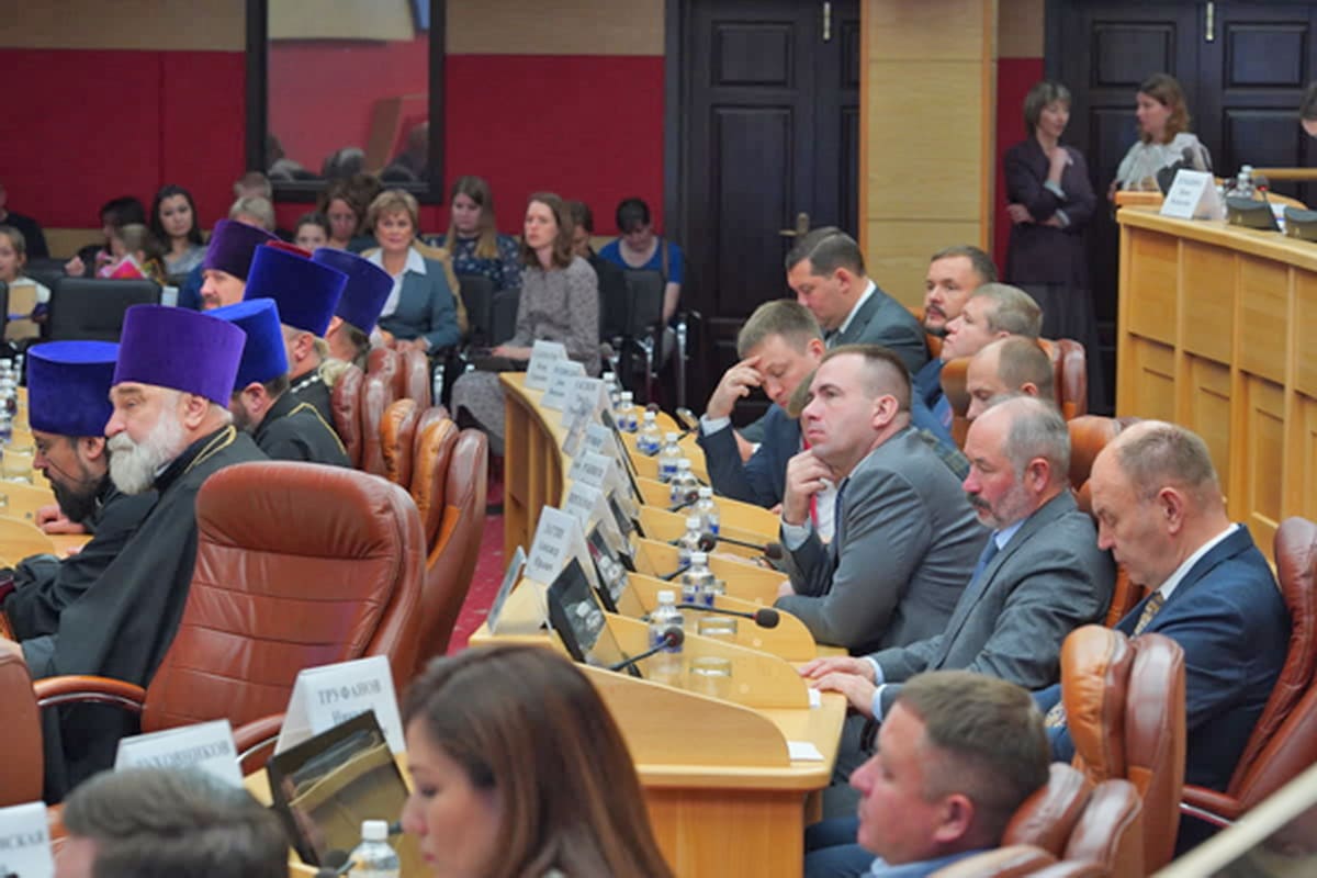30 октября в зале заседаний Законодательного Собрания собрались депутаты, представители духовенства, общественности. Областной парламент представляли председатель Заксобрания Александр Ведерников, вице-спикеры Кузьма Алдаров и Наталья Дикусарова. Со стороны РПЦ в заседании приняли участие митрополит Иркутский и Ангарский Максимилиан, епископ Братский и Усть-Илимский Константин (Мануйлов), настоятели православных храмов Иркутской епархии.