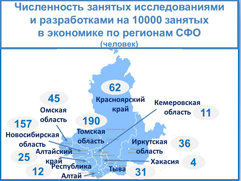 Из всех сибирских регионов наиболее развита наука в Томской и Новосибирской областях, по показателям наукоёмкости экономики опережают нас также Красноярский край и Омская область. Отстаём от лидера в 5–8 раз: в расчёте на 10 тысяч занятых в экономике приходятся 36 человек, причастных к исследовательской работе (в Томской области – 190), внутренние затраты на исследования и разработки составляют 0,3% от ВРП (2,3%).