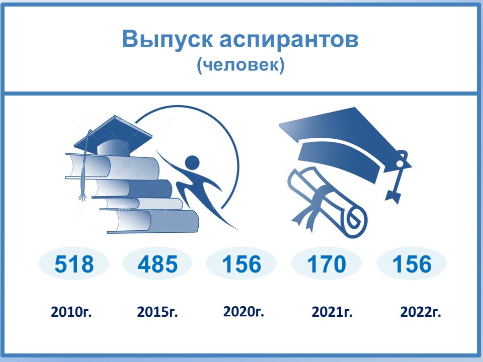 Резко сократился выпуск аспирантов, в 2022 году учёбу закончили 156 человек, из них лишь 9 выпускников (6%) – с защитой диссертации. Это самый низкий уровень эффективности обучения, раньше каждому четвёртому выпускнику удавалось по завершении учёбы получить кандидатскую степень.