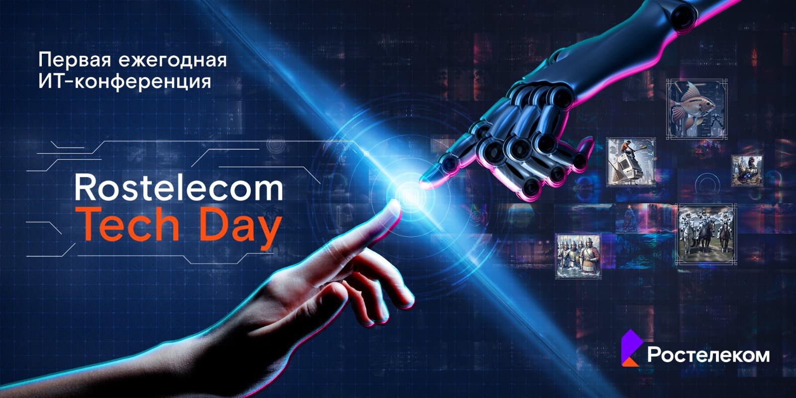 Визуальное сопровождение Rostelecom Tech Day было создано цифровыми художниками. Гости проходили через виртуальную галерею, событие сопровождалось презентацией цифровых произведений искусства, состоялась лекция об NFT-движении и цифровом искусстве. Гостем Rostelecom Tech Day стал известный цифровой художник Артём Ткач. «Какая связь между Ростелекомом, IT, цифровыми продуктами, искусственным интеллектом, блокчейном? Задумайтесь. Как это можно собрать в одну историю? — говорит Кирилл Меньшов. –Тысячелетиями человечество развивается благодаря трём граням, которые друг друга усиливают. Это технологии, сам человек и искусство. Все глубоко взаимосвязано. Нам с вами повезло жить в эпоху, когда искусственный интеллект вступает в это триединство четвёртым полноправным членом. Искусственный интеллект начинает влиять на технологии, он позволяет ускорять создание белков, лучше моделировать, делать более быстрой IT-разработку. Одновременно и технологии влияют на искусственный интеллект, он появится не сам по себе. ИИ влияет на искусство, позволяет создавать совершенно новые образы, объекты. Это то, что мы называем цифровым искусством. Однако это художник берет в руки нейросети и создает то, что мы с вами видим. То же самое с человеком – ИИ создан человеком, и не родился сам по себе. При этом он меняет нашу жизнь и очень сильно, упрощает, например, быт. Он позволяет нам быть продуктивнее, мы можем использовать его в наших разработках. «Ростелеком» представляет концепцию нового единения – технологии, людей, искусственного интеллекта и искусства. В этом мы видим дальнейший эволюционный этап развития человечества.