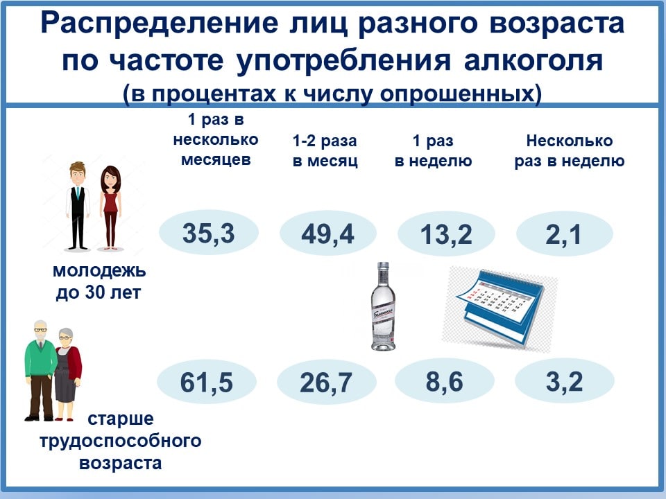 Доля пьющих среди младшего и старшего поколения различается незначительно, однако для молодёжи характерно более частое употребление спиртного. А среди перешагнувших черту трудоспособного возраста регулярно пьющих значительно меньше, старики, как правило, выпивают очень редко (по праздникам).