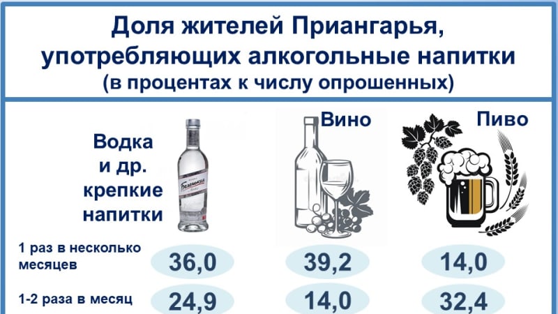 Вкус алкоголя знаком каждому второму жителю Приангарья. В употреблении спиртных напитков дамы отстают от сильного пола, а селяне – от городских жителей.