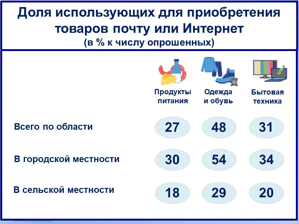 В последние годы довольно активно используется Интернет, через мировую сеть можно купить многие товары. Каждый второй из опрошенных жителей Приангарья использует Интернет в этих целях. Чаще всего таким образом приобретается одежда и обувь, причём более активны в этом городские жители.
