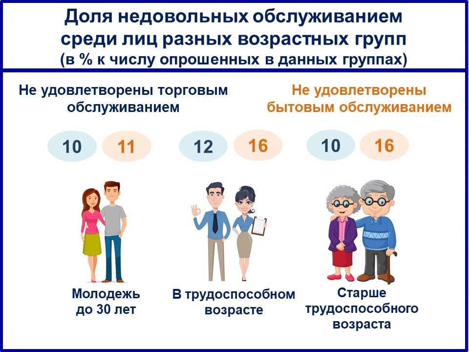 Казалось бы, женщинам больше свойственно замечать недостатки. Однако среди них недовольных торговым и бытовым обслуживанием меньше – соответственно 11% и 15% против 13% и 17% среди мужчин.