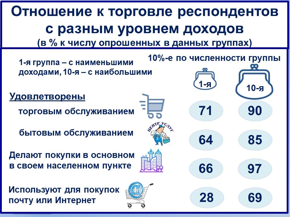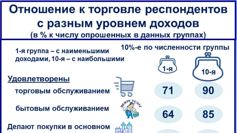 Отношение к торговле во многом зависит от благосостояния. Это выявлено в ходе обследования. В отличие от малообеспеченных, наиболее состоятельные граждане чаще бывают довольны торговым и бытовым обслуживанием. Живя, как правило, в крупных городах, они совершают покупки преимущественно в своем населённом пункте и в этих целях чаще используют Интернет.