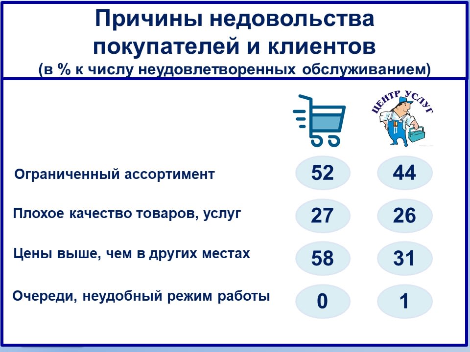 И в торговле, и в сфере сервиса недовольство вызывают чаще всего высокие цены и ограниченный ассортимент.