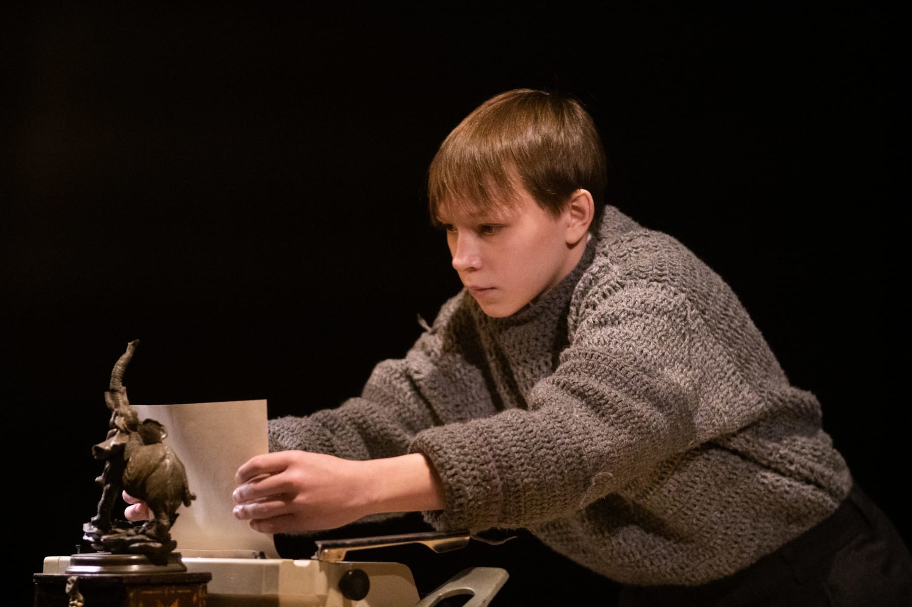 С бумажным быком великого романа постановщику совладать было гораздо трудней. Эта глыба дрессировке поддаётся с видимым сопротивлением. Сам создатель сценической версии, шутя, признаётся, что решал непростую задачу – «портил» первоисточник. Автор инсценировки сосредоточился на центральной любовной линии, сократив количество участников сюжета до пяти персонажей. Плюс герой, которого нет у Хемингуэя, — сын погибшего бойца интернациональных бригад Роберта Джордана, подросток по имени Эрнесто. Эту роль, что в постановке выполняет стилеобразующую, «несущую», так сказать, функцию, исполнил воспитанник студии «Драма» Сергей Алексеенко. Именно его глазами, его воображением воссоздаются на игровой площадке события 1937 года в Кордильерах, где республиканцы должны взорвать мост и обеспечить успех наступления против франкистов. Через призму фантазии потомка картины войны и герои эпопеи выглядят чуть идеализированными, романтически приподнятыми, мифически чудесными. Эпический строй повествования уступает место поэтической стихии, испанской экзотике, мощный пацифистский пафос – элегическому звучанию лавстори, философская притча – мелодраме.