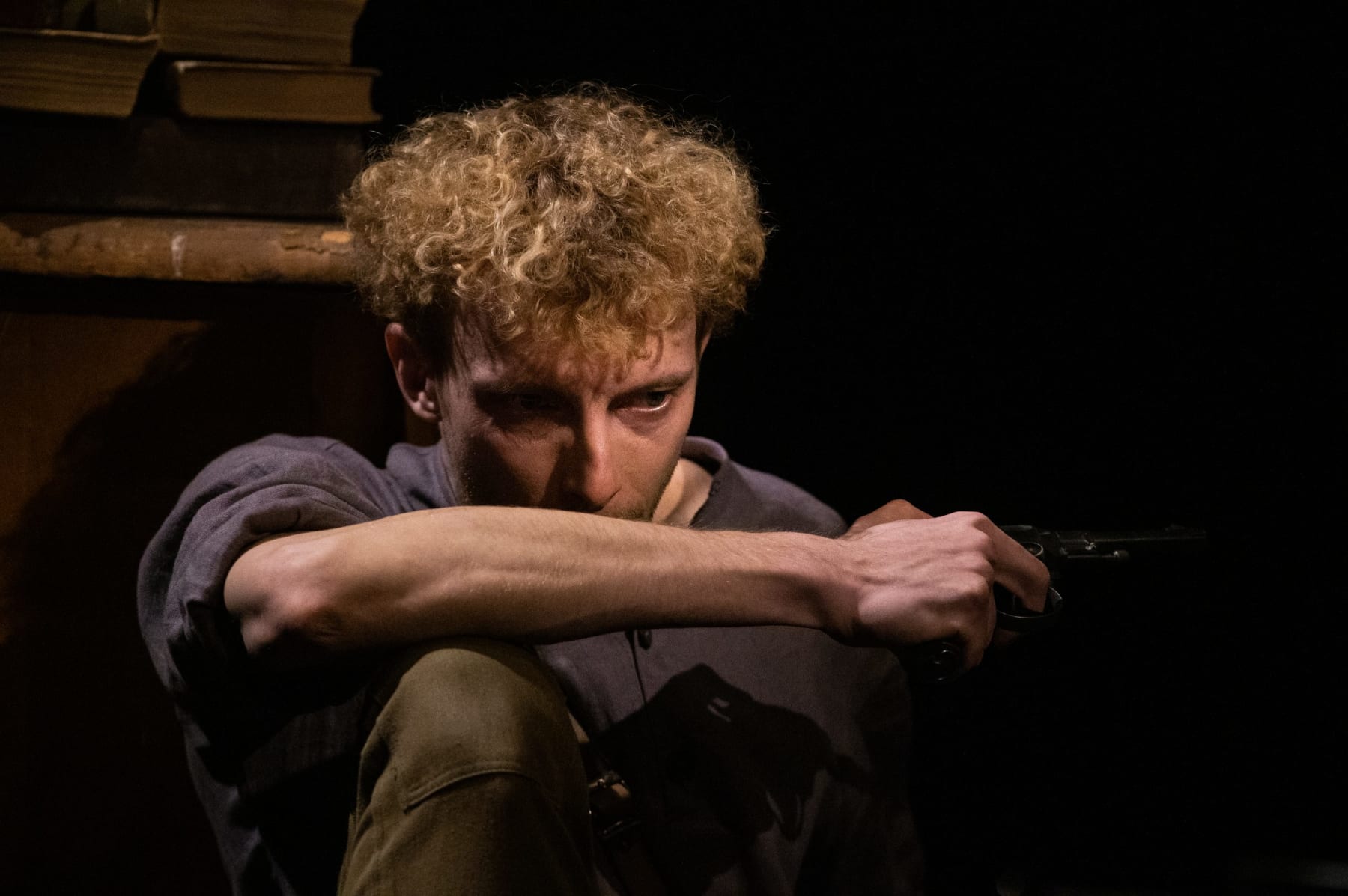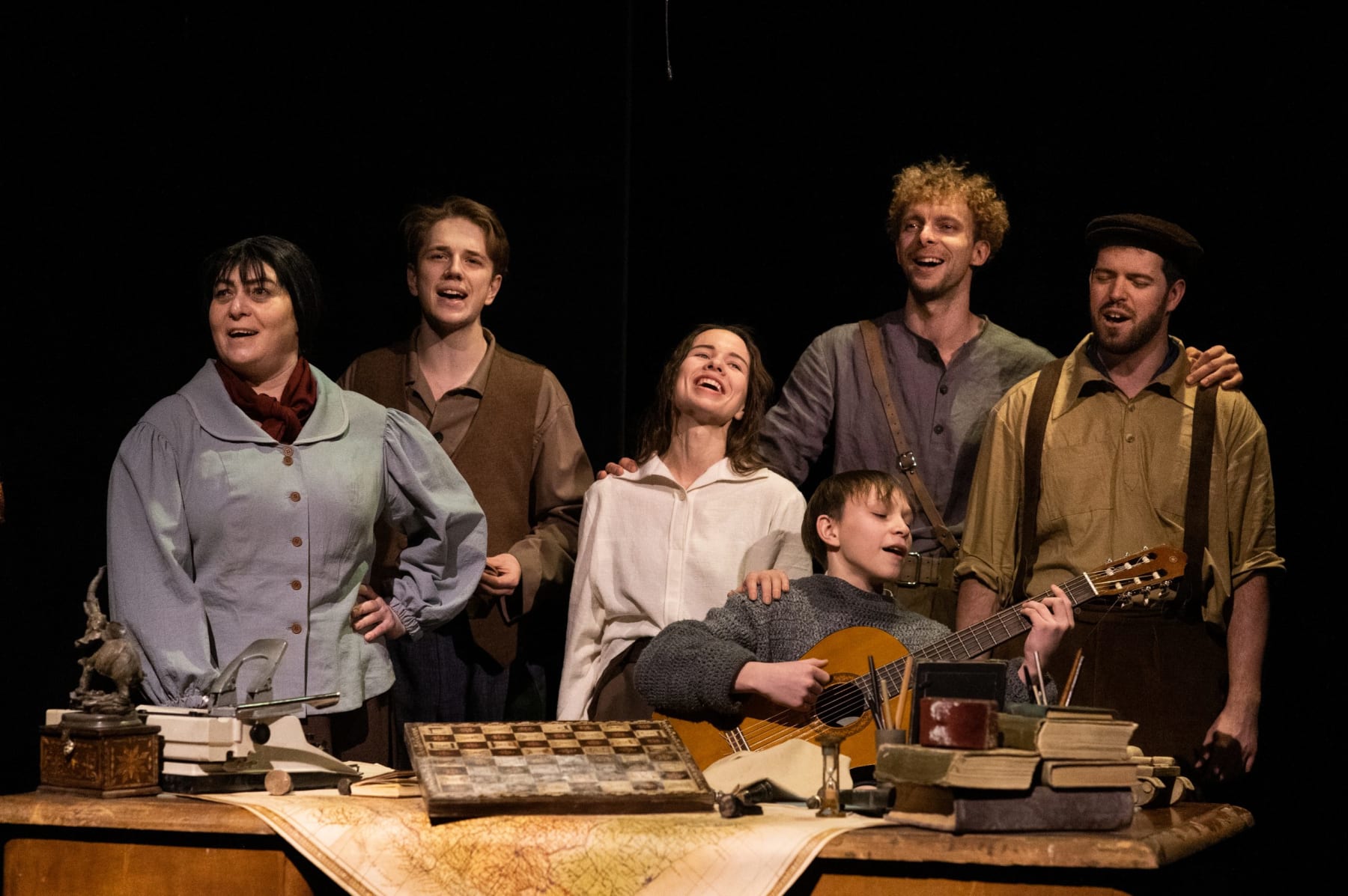 Мы оказываемся не столько на войне, бесчеловечной гражданской войне, отнимающей жизни, ломающей судьбы, калечащей души, сколько во внутреннем космосе человека, открытого чудотворению жизни и любви, всегда побеждающей смерть и ненависть. Этот лейтмотив спектакля считывается зрителем безошибочно и органично, делая сценическую версию одновременно легче, проще, но и светлее, теплее книги. Правда романа, жёсткая, суровая, порой беспощадная, смягчается тем, что сын главного героя Эрнесто «играет в войну». Войны – чудовищные, опустошительные игрища слепцов. Нет в них правды, не бывает победы. Правда и музыка – только в любви. Любовь – «всё равно, продлится ли это полтора дня или многие годы, останется самым главным, что только могло случиться в жизни человека». Роли влюблённых – американца Роберта и юной испанки Марии – исполняют Иван Гущин и Ольга Гарагуля. Артисты выбирают осторожные, нежные, акварельные краски, не пытаясь проживать пылкие чувства «на разрыв аорты». Это привносит в историю характер чистоты и одновременно беззащитности. Игра в оттенках пиано точнее и глубже попадает в зал.