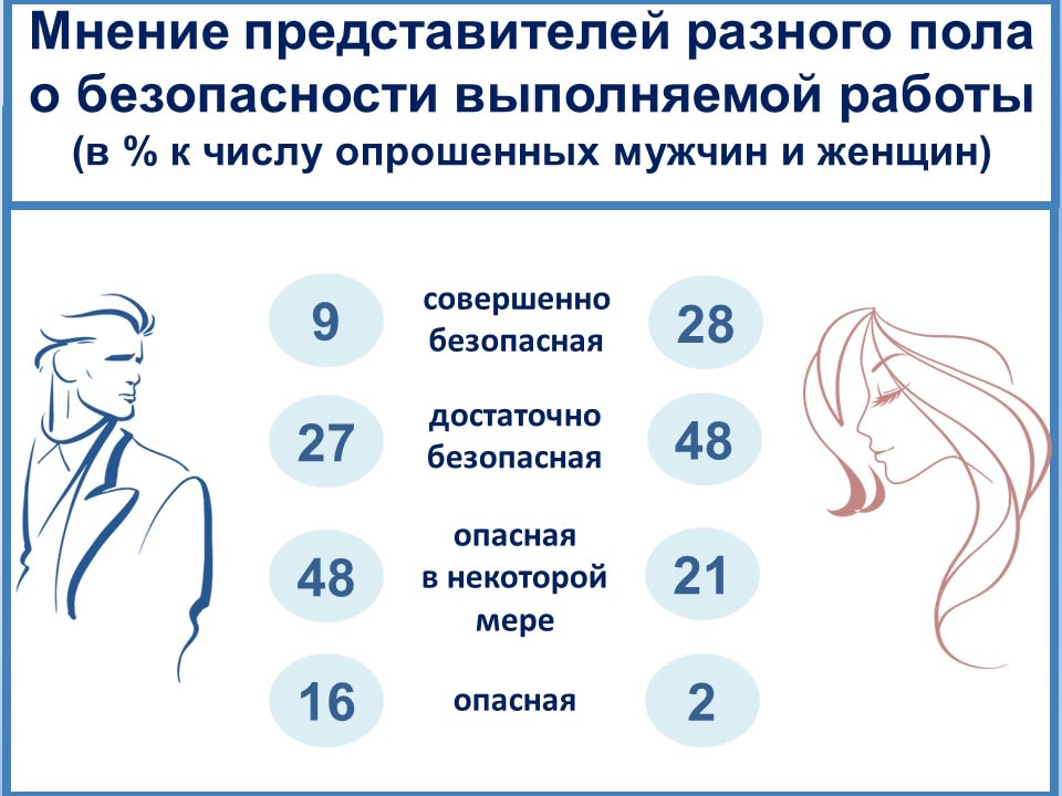 В сравнении с мужчинами женщины заметно чаще бывают довольны режимом работы и расстоянием до рабочего места, условиями труда, а по другим параметрам (надёжность, обязанности, профессиональная и моральная удовлетворённость) их мнения почти совпадают.
