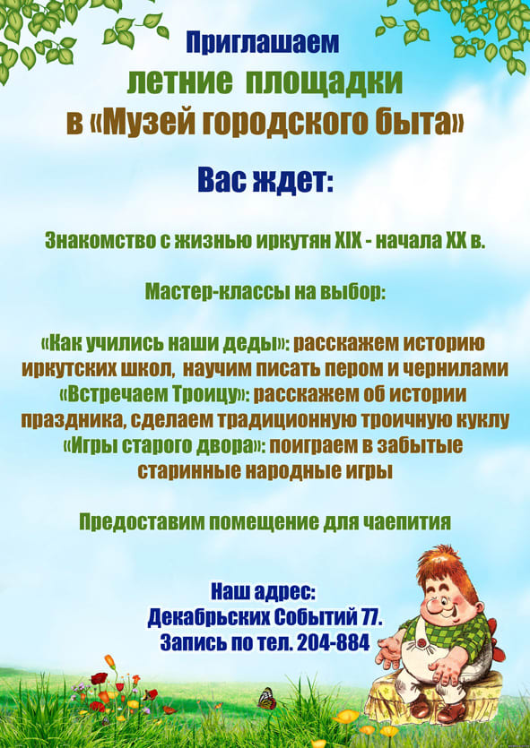 25 мая в 14.00 – «Весеннее настроение» – открытие отчётной выставки студии Дома ремёсел и фольклора ИЗО и ДПИ «Радуга» – (руководитель Н.П. Балакина). С 25 мая – выездные интерактивные занятия на летних площадках СОШ г. Иркутска (по заявкам).