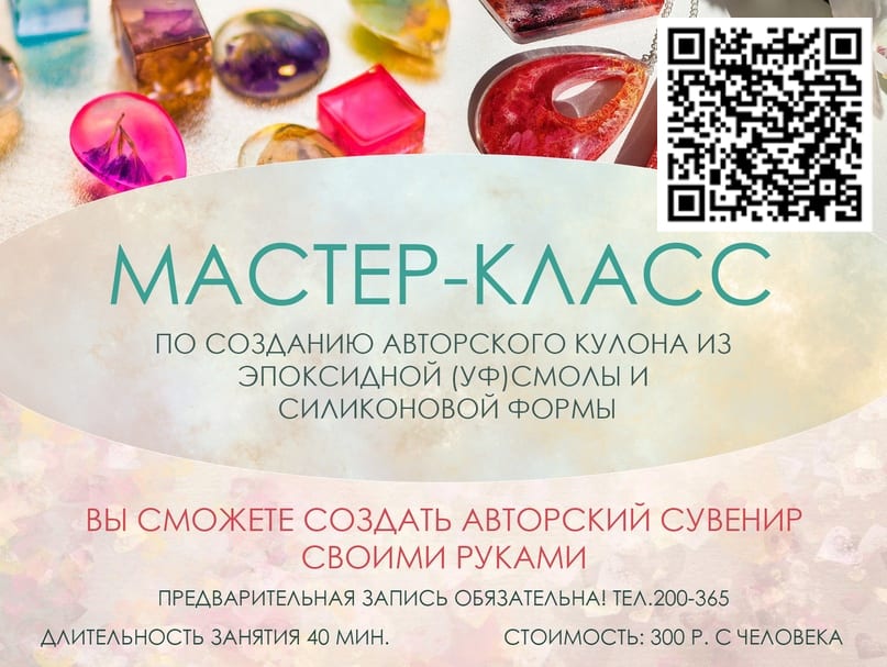 – по созданию кулона из УФ-смолы с летними сухоцветами (по записи, с собой ничего приносить не нужно): начало в 13.00, 16.00, 18.00, цена билета 300 руб.;