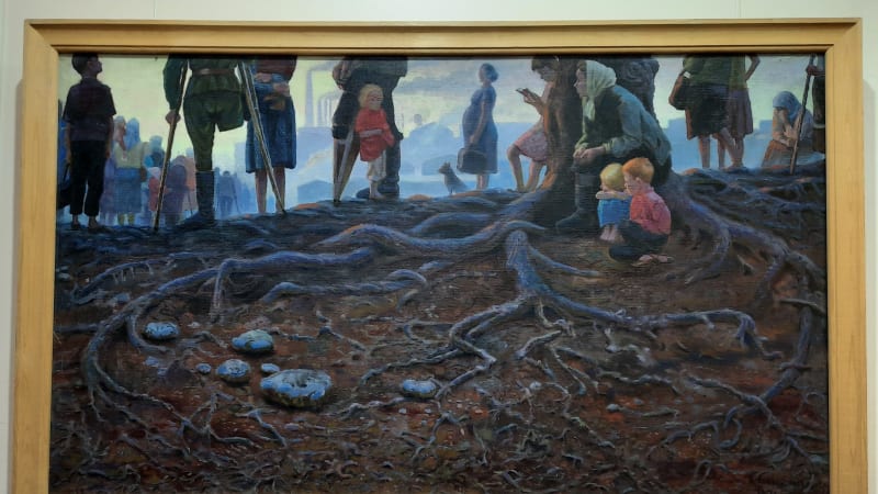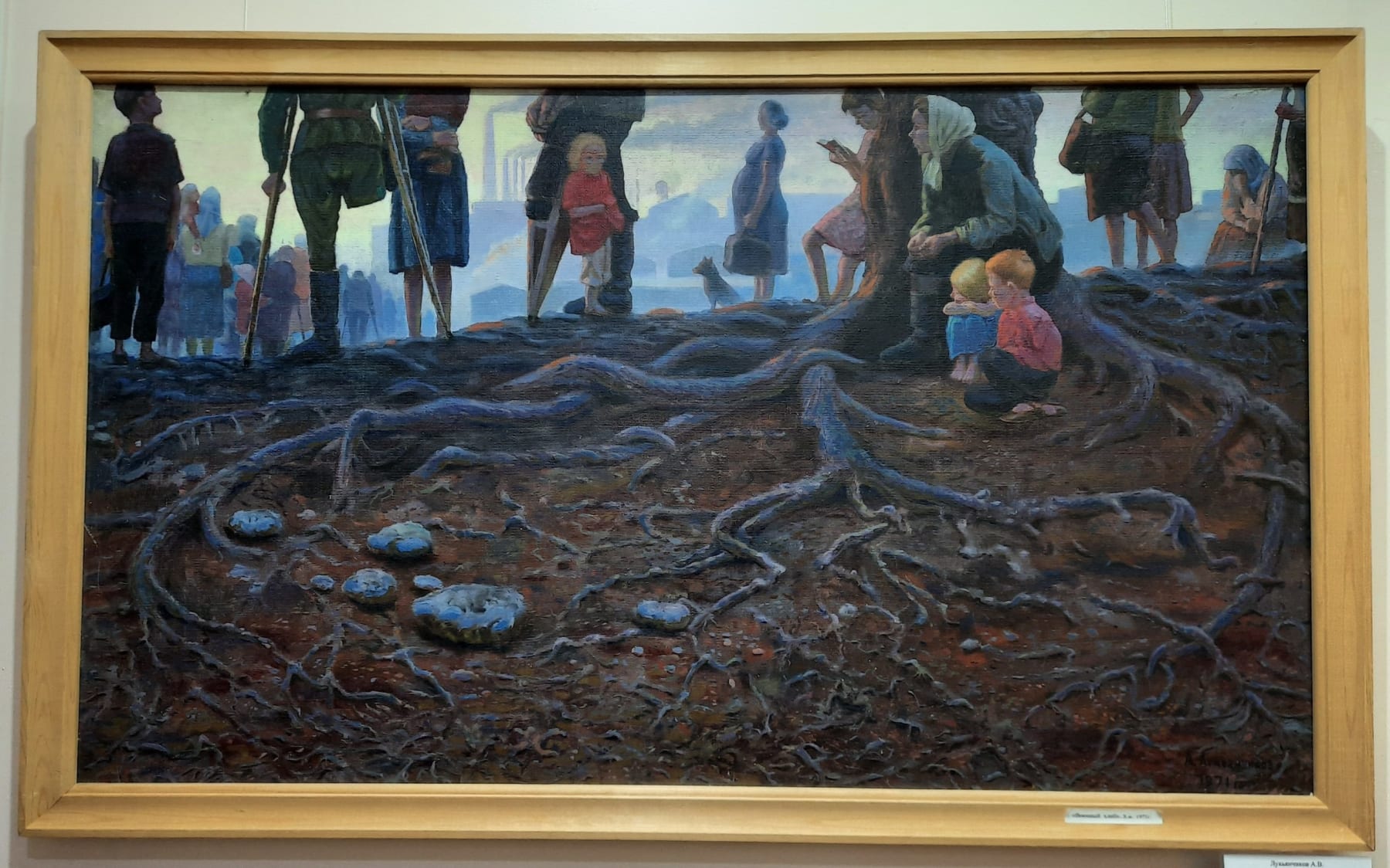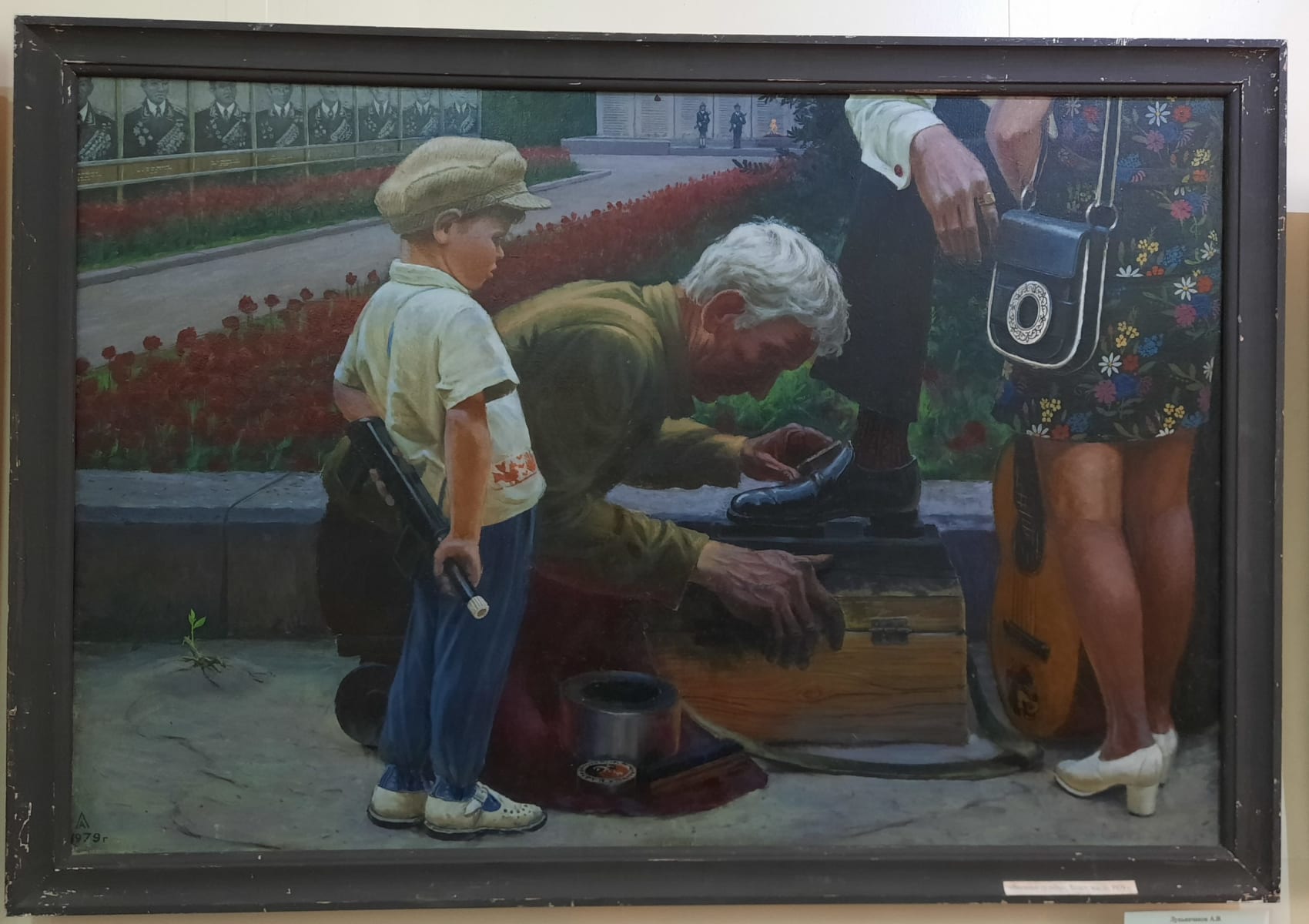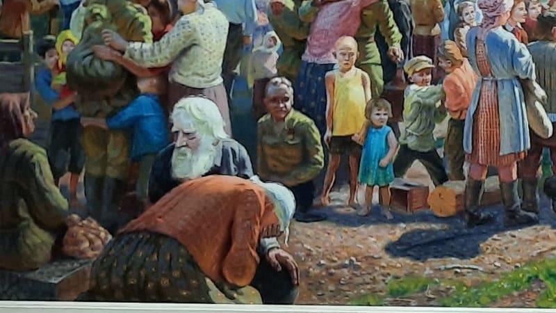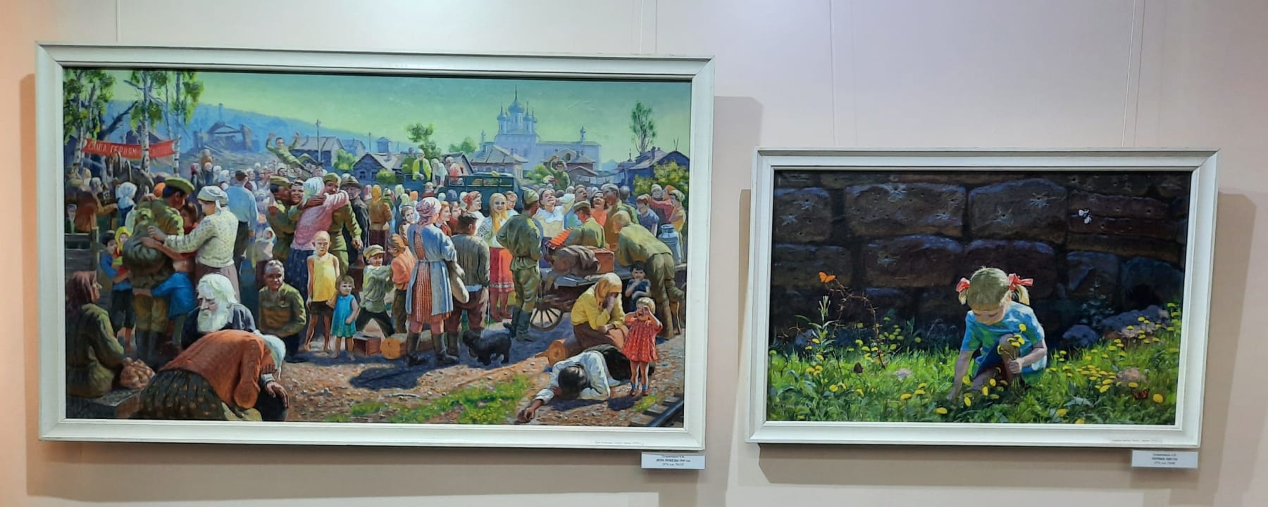 Вот и в этот раз на открытии выставки зрители были потрясены неприкрытой правдой личных трагедий людей в буднях военного лихолетья. Картины «Похоронка», «Военный хлеб», «Письмо», «Ожидание» делают нас сопричастными тому суровому и трагическому испытанию, которое перенёс наш народ в суровые годы войны. Щемящей болью в сердце отзывается судьба инвалида воина-победителя на картине «Военные судьбы», чистящего туфли тем, кого он защитил ценой собственной жизни. Радостный и горький День победы 1945 года. Спокойный, но печальный День победы спустя 50 лет. На первой картине горечь от невосполнимой утраты о тех, кто не дожил до этого дня. На второй — печаль о том, что ветеранов становится всё меньше и меньше.