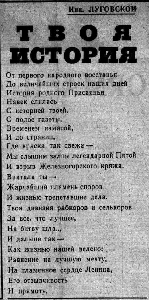 В стихотворении иркутского и сибирского поэта-фронтовика Иннокентия Луговского, посвящённом газете «Восточно-Сибирская правда» и опубликованном на первой полосе издания 14 мая 1967 года, он, ничтоже сумняшеся, пишет, обобщая, про родное Присаянье.