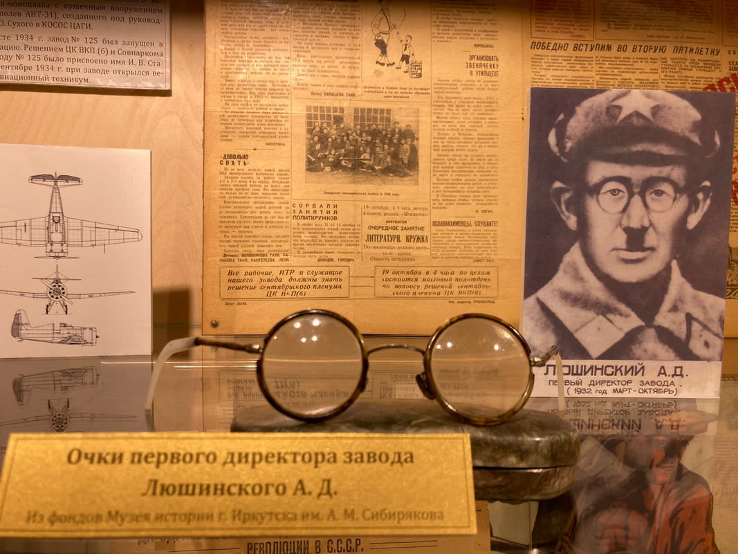 В фондах Музея истории Иркутска хранится необычный экспонат – очки первого директора завода – Александра Даниловича Люшинского. Авиамеханик Русской императорской армии, после революции – военком авиашколы, он с марта по октябрь 1932 года руководил выбором площадки и строительством авиазавода. В газетах того времени слово «завод» упоминалось не часто, сначала писали просто: «Строительство №125». Уже в декабре 1932 года «Восточно-Сибирская правда» сообщала: «Объявляется приём на курсы столяров и медников-жестянщиков». Обучение проходило в поселке Ленина (ст. Иннокентьевская), а вот само заводоуправление первое время находилось на улице Карла Маркса, дом 4а. Отдел подготовки кадров располагался в бараке №13 посёлка Ленина. Александру Люшинскому приходилось решать и хозяйственные задачи – рабочих обещали кормить. При заводе сразу же был создан совхоз (бывший колхоз «Большевик») на развёртывании таких хозяйств при стройках настаивал Востсибкрайисполком. Сохранилось объявление в газете «Восточно-Сибирская правда» за 15 октября 1932 года: «Совхоз завода 125 покупает кроликов… Директор Люшинский». Вскоре Люшинского сменил Владимир Ирьянов.