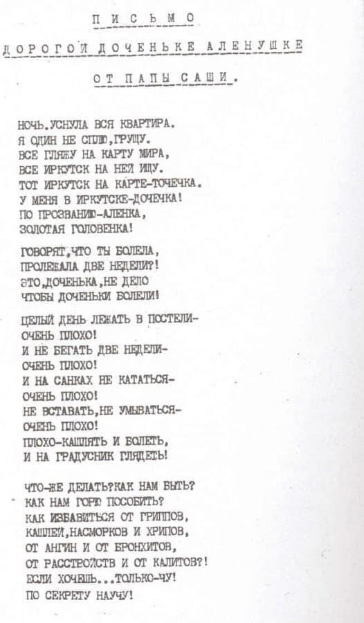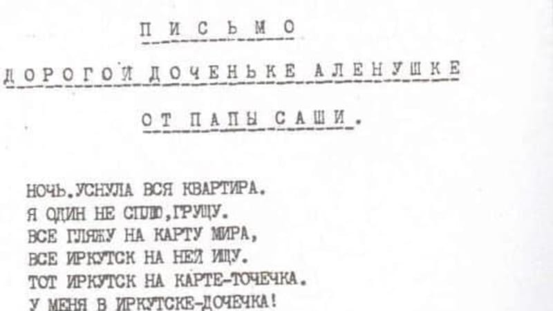 Стихотворение является частью письма Галича первой жене Валентине Архангельской, которая в это время жила в Иркутске с 7-летней дочерью Алёной и работала в областном Драматическом театре.