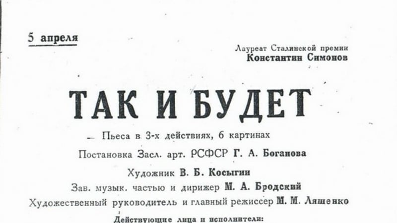 22 июня 1941 года на утреннем комедийном спектакле в нашем театре произошло ЧП: один из артистов пропустил свой выход во втором акте, из-за чего была загублена целая сцена. Казус неслыханный, такое случается крайне редко и, разумеется, влечёт самые строгие последствия. Но на этот раз до них не дошло. Всех потрясла страшная весть по радио: началась война. В это не сразу даже поверили в нашей тихой глубинке. Вечером в театре состоялся короткий митинг. Творческий коллектив, как и вся страна, шагнул в новую суровую реальность.