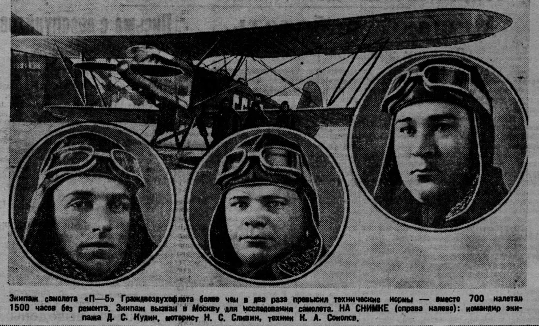 «Экипаж самолёта П-5 Л-1742, работающий в Саянских хребтах на линии Н.-Удинск — слюдяной рудник, применяя стахановские методы и бережно относясь к материальной части, перевыполнил производственное задание, налетав вместо 700 часов — 1500 часов. Сделано 1500 полётов. Перевезено 638 тонн грузов и 1087 пассажиров. За это время не было ни единой аварии и вынужденной посадки.
